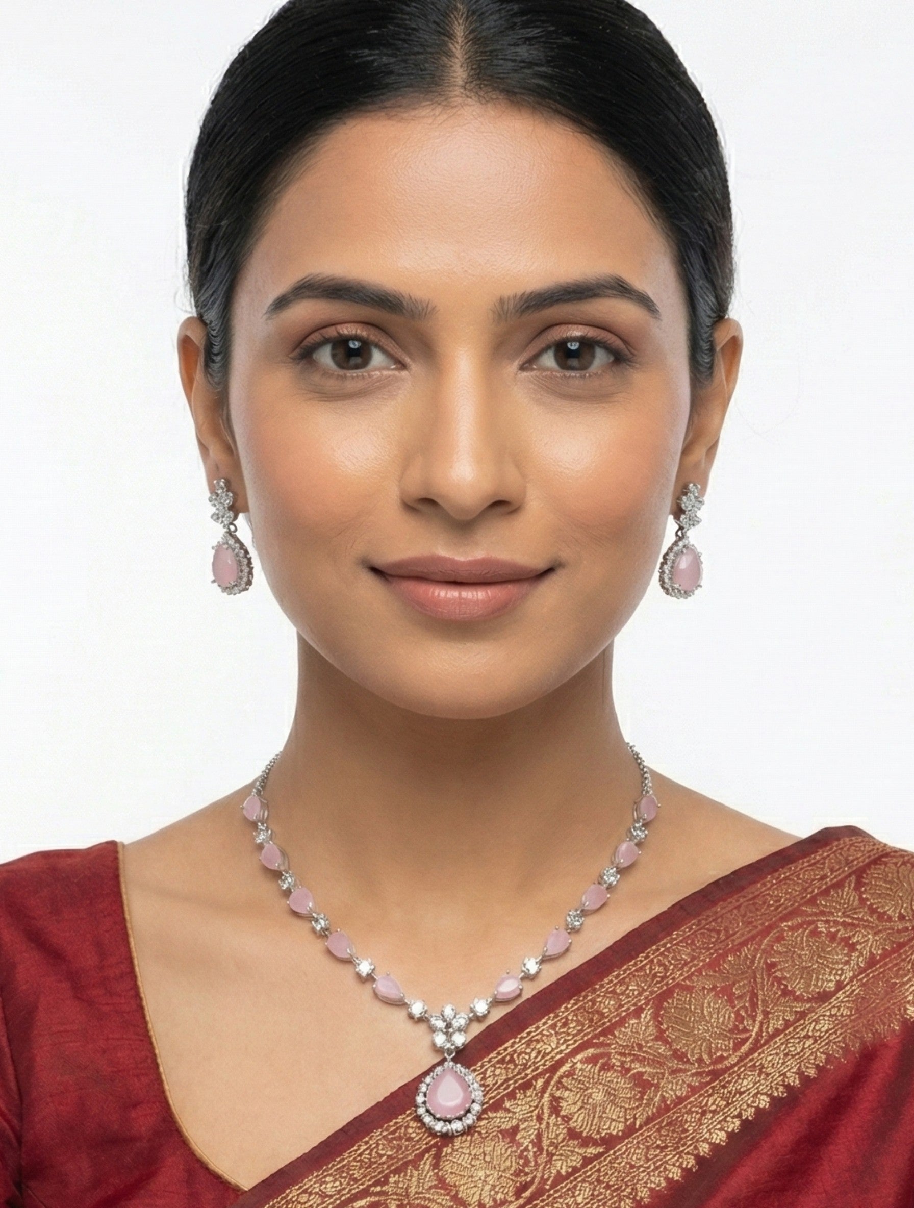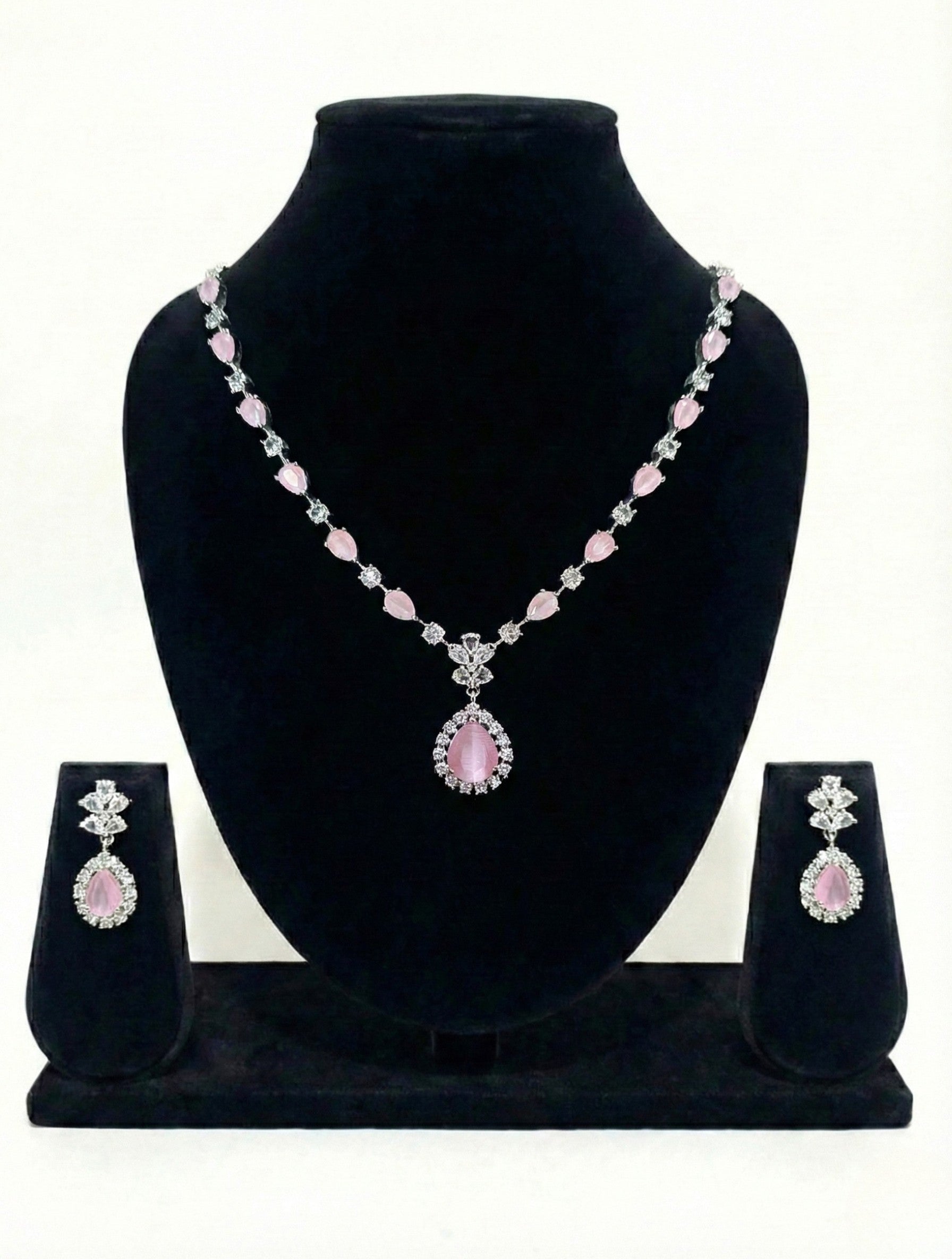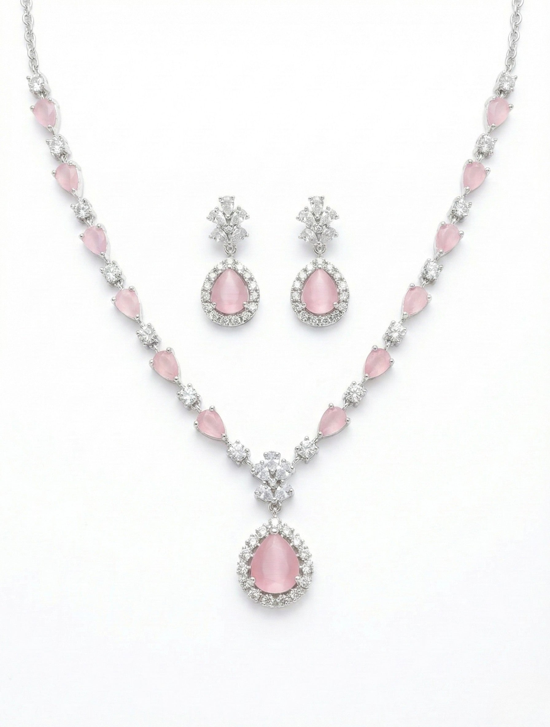 The necklace features a slim, beautifully aligned chain of soft pink stones accented with sparkling diamonds, leading to a stunning teardrop-shaped center pendant framed with brilliant American diamonds. The matching drop earrings mirror the same design, creating a harmonious and polished look. Finished in a sleek silver-tone polish, this set radiates subtle sparkle and premium appeal.
