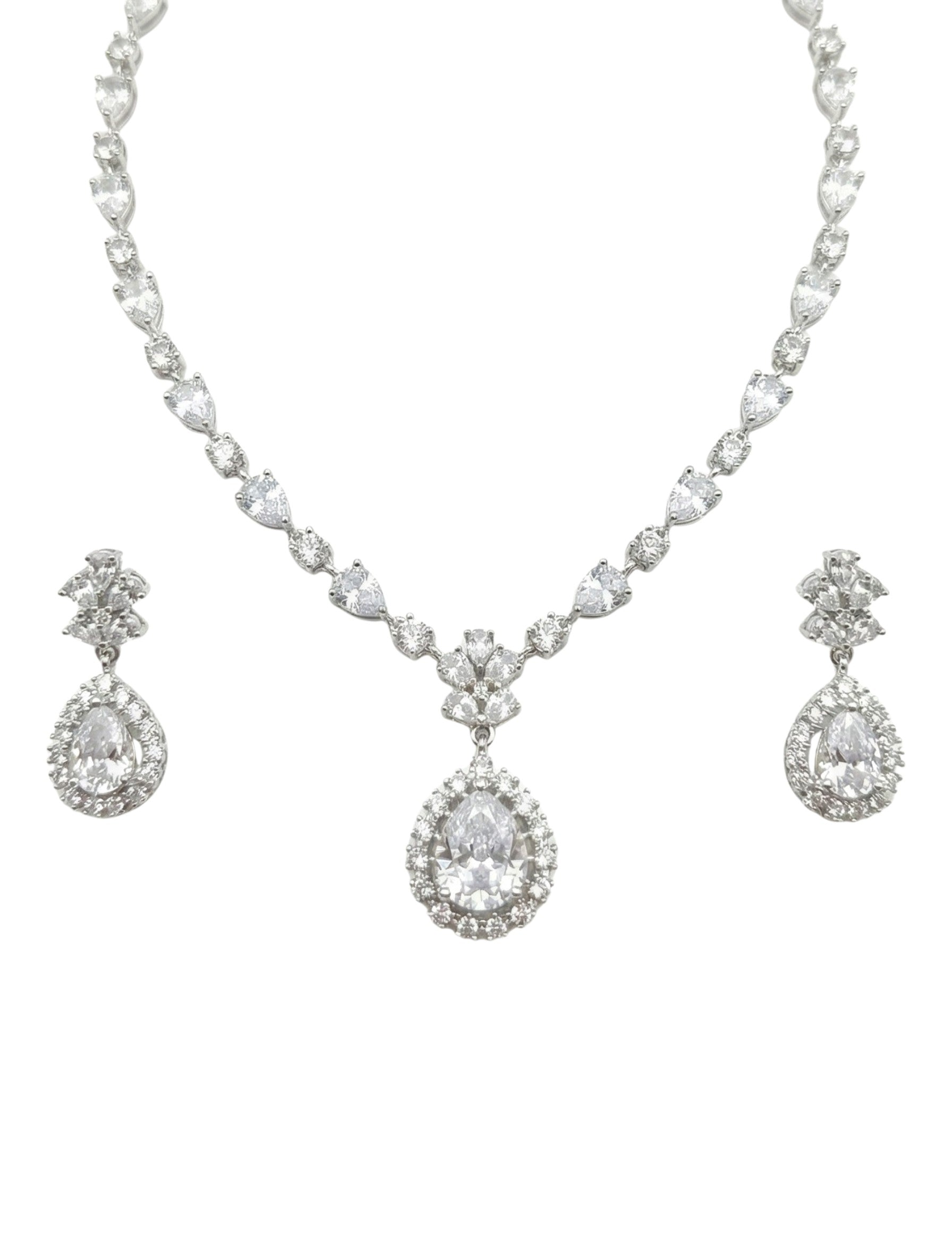 The necklace design sits beautifully on the neckline, offering a balanced blend of simplicity and luxury. The matching drop earrings mirror the same teardrop motif, enhancing facial features with a soft, elegant sparkle. Finished in a polished silver-tone, this set delivers a true diamond-like brilliance without being heavy.