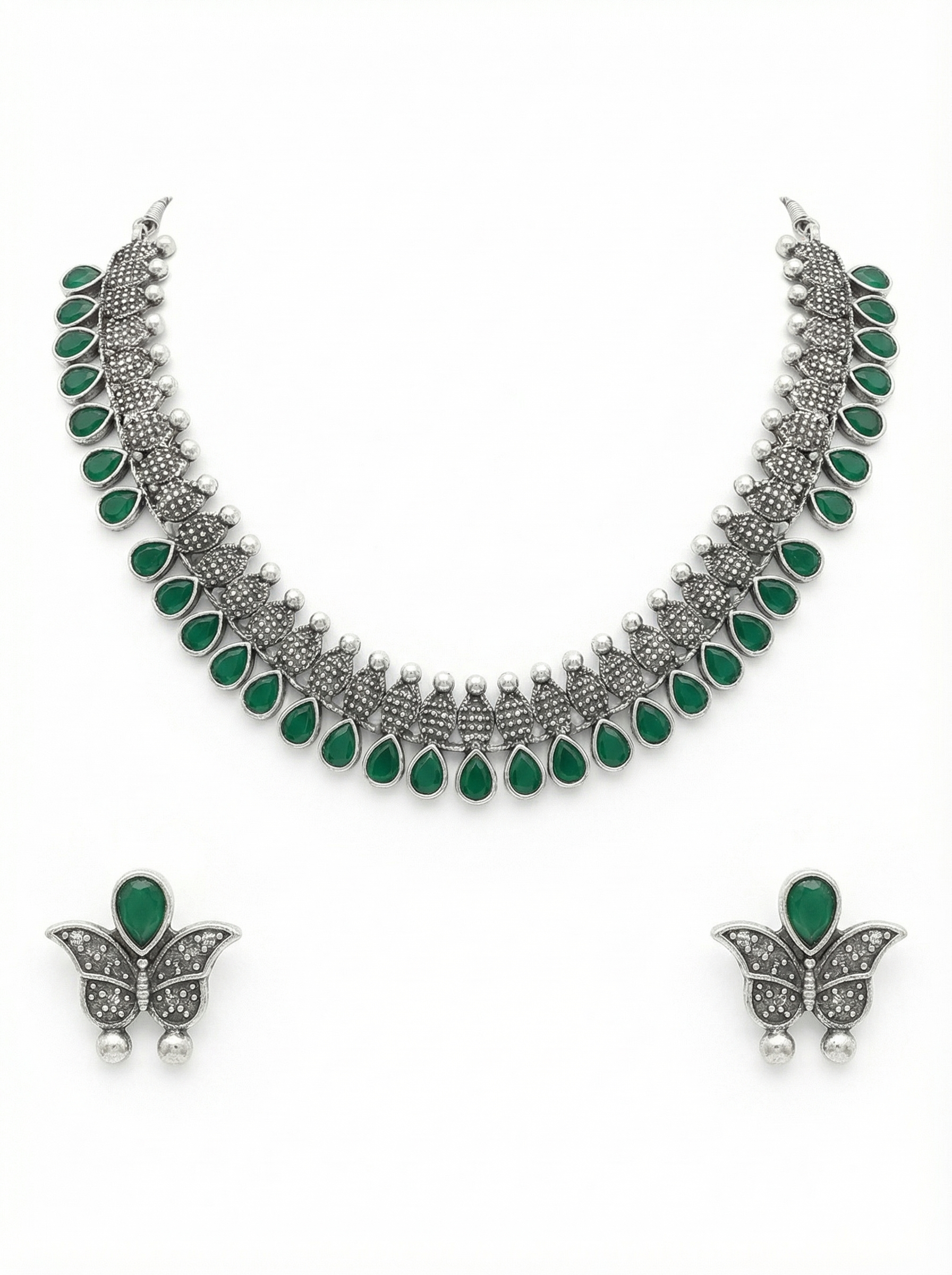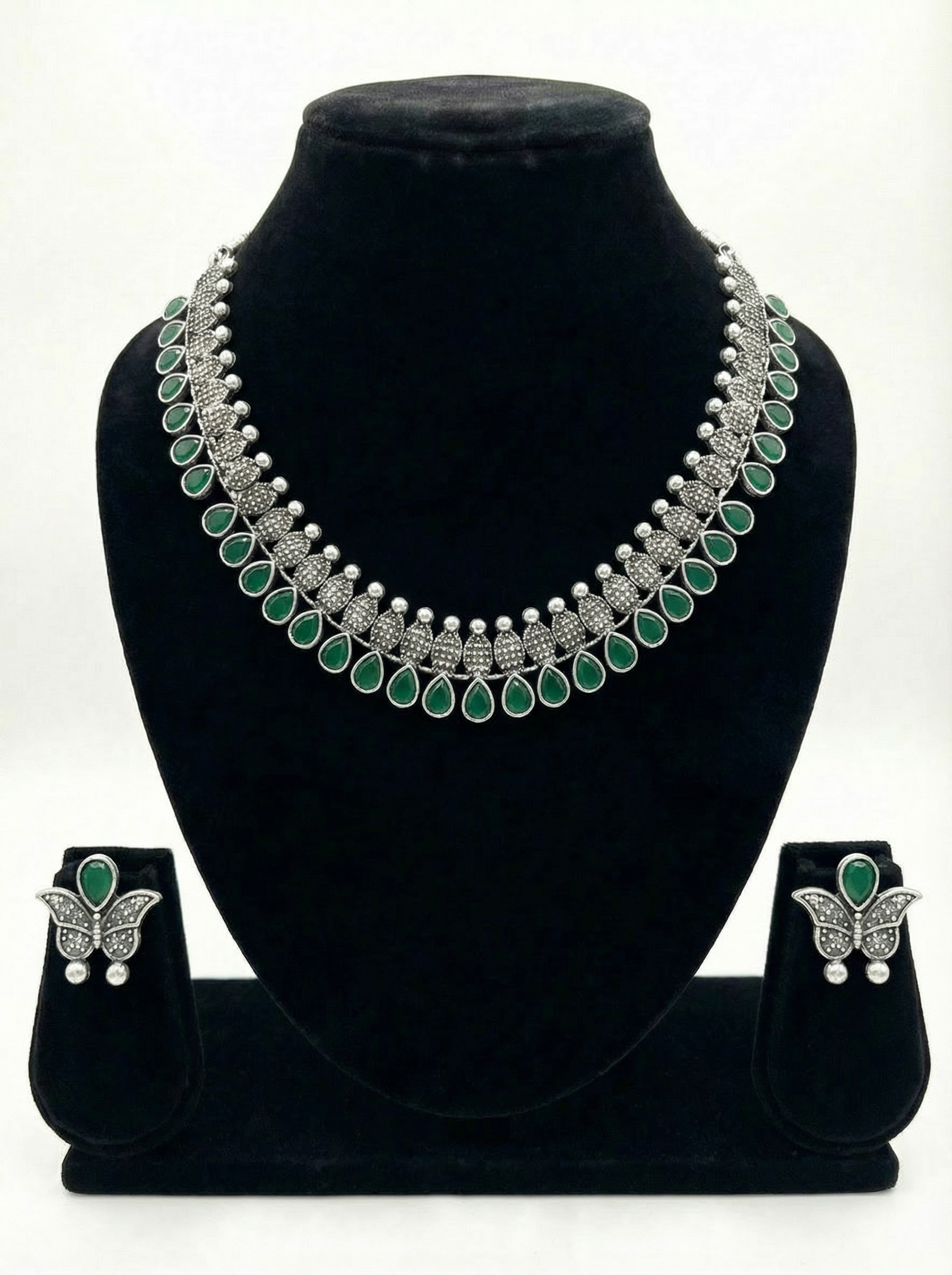 This statement necklace set features deep green teardrop stones arranged in a symmetrical traditional pattern, finished with an oxidised silver-tone base. The layered design gives a bold yet balanced look — heavy enough to stand out, but clean enough to not look overdone.