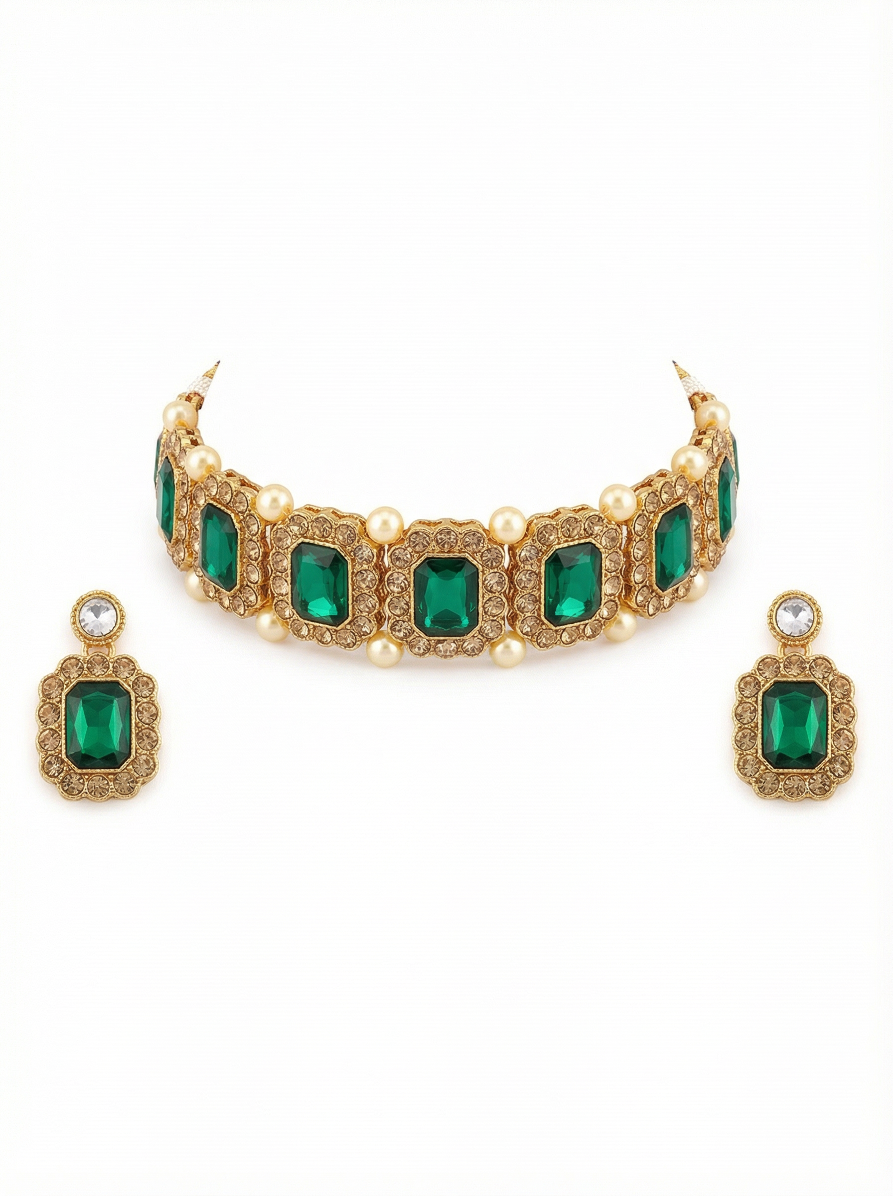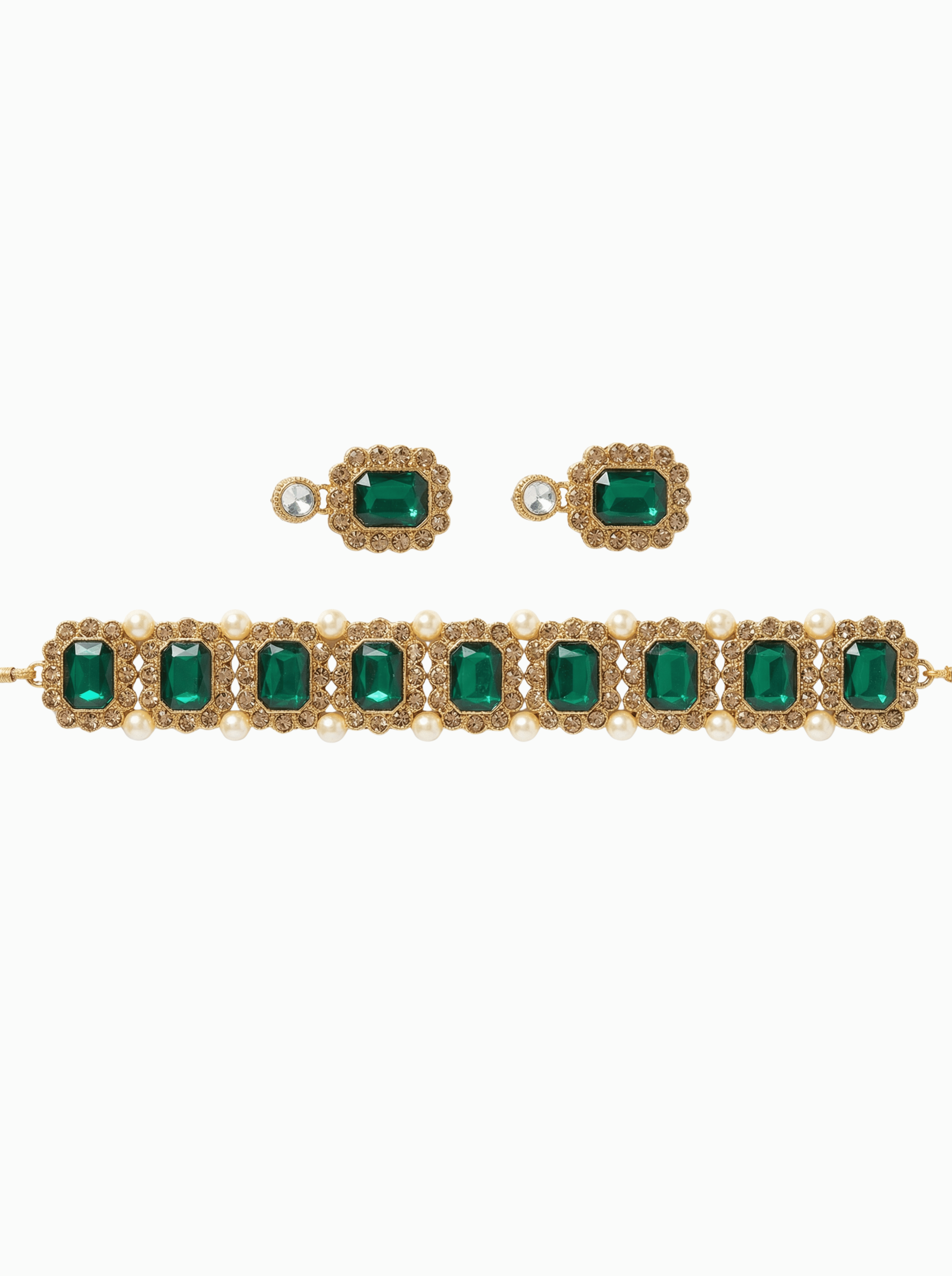 The Emerald Pearl Statement Choker Set is designed for a refined ethnic look with strong visual impact. The choker features deep emerald-green rectangular stones set in a warm gold-tone base, detailed with subtle crystal accents and finished with soft pearl highlights that balance the boldness of the design. The matching earrings echo the same structure, creating a well-matched and elegant set.