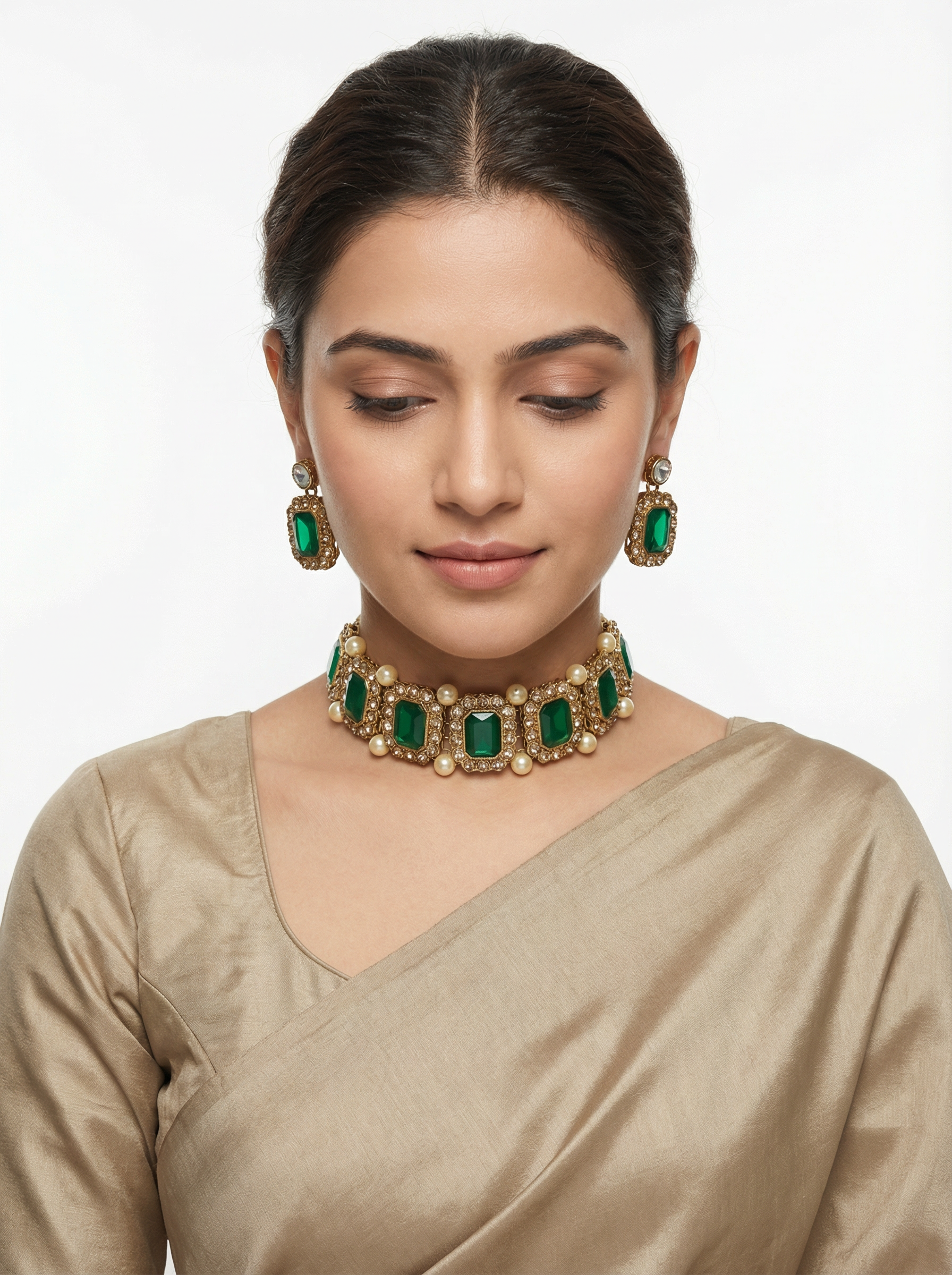 Sitting perfectly along the neckline, this choker enhances traditional outfits without overpowering them. The rich green tone pairs beautifully with sarees, lehengas, and neutral or earthy-colored ethnic wear, making it an ideal choice for weddings, festive gatherings, and formal celebrations where understated elegance matters.