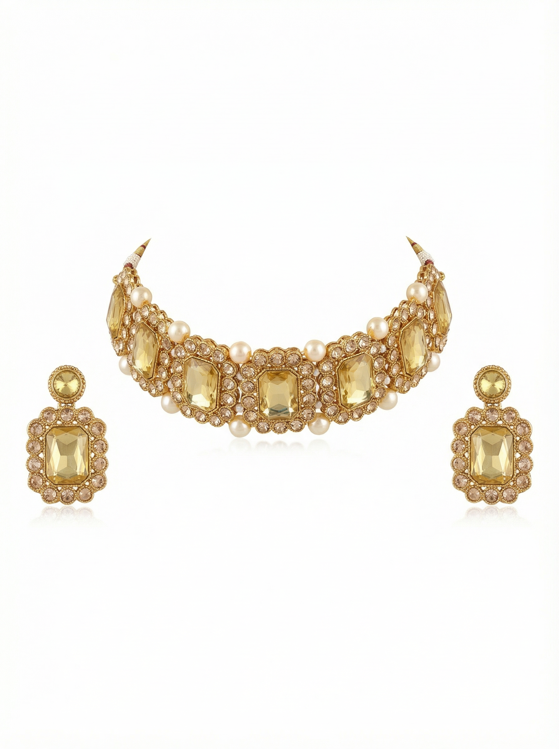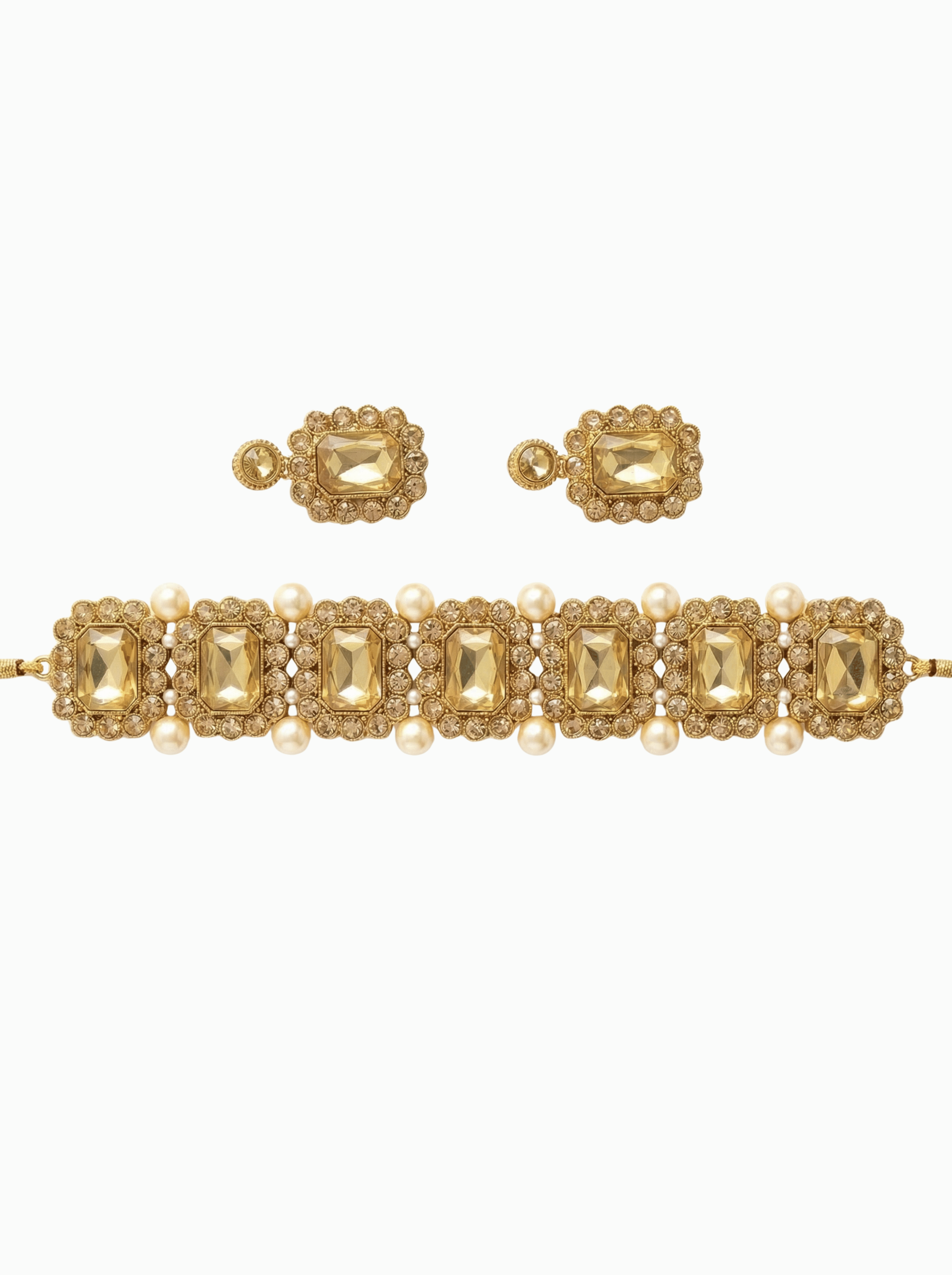 This Champagne Pearl Statement Choker Set is crafted for a refined, elegant look with a soft luxury finish. The choker features champagne-yellow rectangular stones set in a warm gold-tone base, surrounded by subtle crystal detailing and balanced with classic pearl accents. The matching earrings follow the same design language, creating a cohesive and polished set.