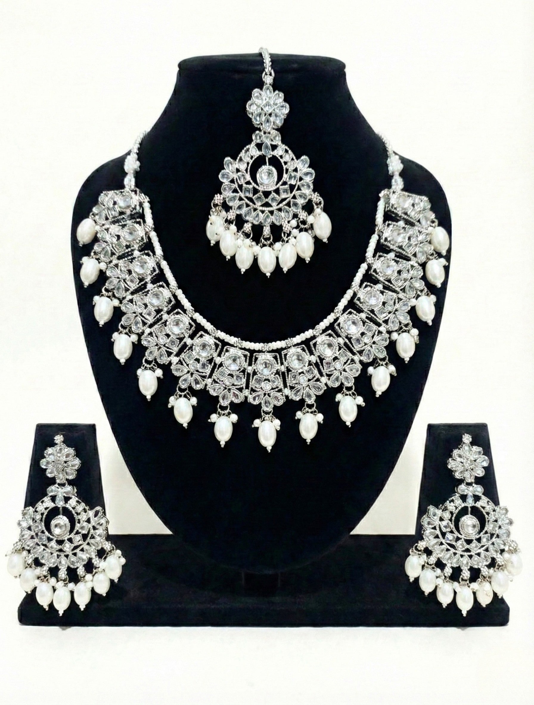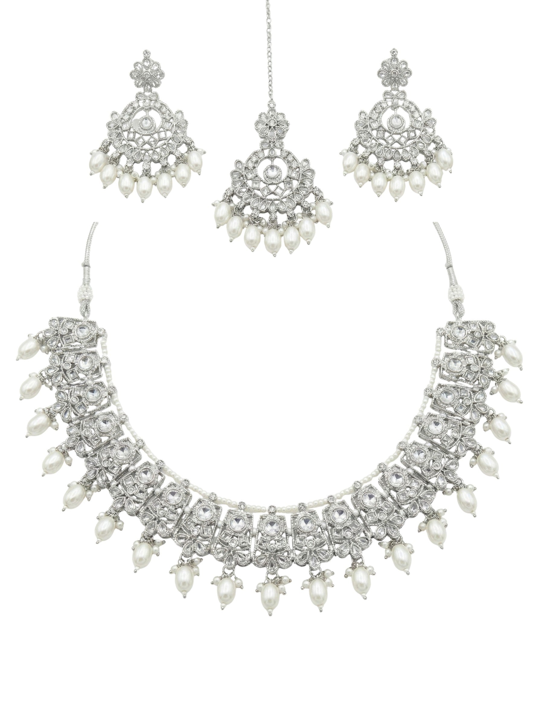 This refined stone jewellery set showcases an intricately crafted silver-tone choker necklace adorned with clear stones and soft ivory pearl drops, creating a graceful and balanced bridal look. Paired with matching chandelier earrings and a delicately detailed maang tikka, the set reflects classic elegance with fine craftsmanship. Ideal for weddings, receptions, and formal occasions, this design offers a timeless appeal that complements both traditional and contemporary outfits without looking heavy or overdone.