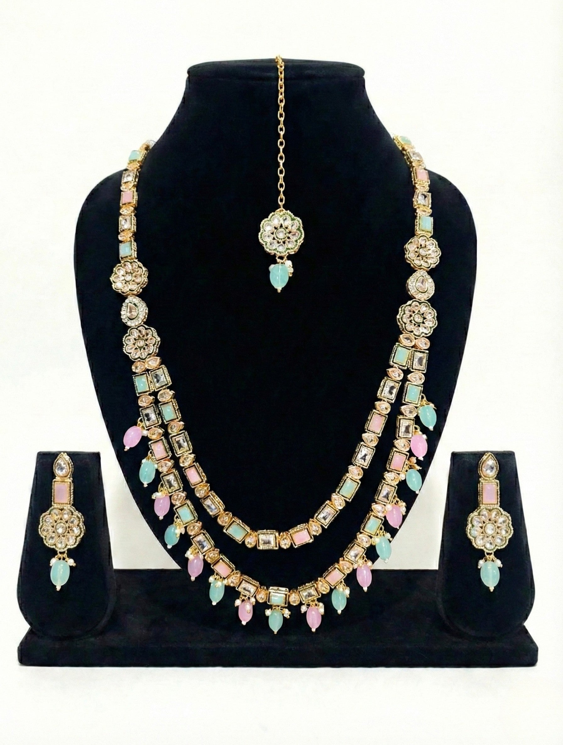 The necklace showcases finely detailed floral kundan motifs combined with rectangular pastel stones, creating a balanced and luxurious layered look. Soft pastel bead hangings add movement and charm, while the center floral pendant enhances the royal appeal. The set is completed with matching statement earrings and a coordinated maang tikka, making it a perfect full jewellery set.