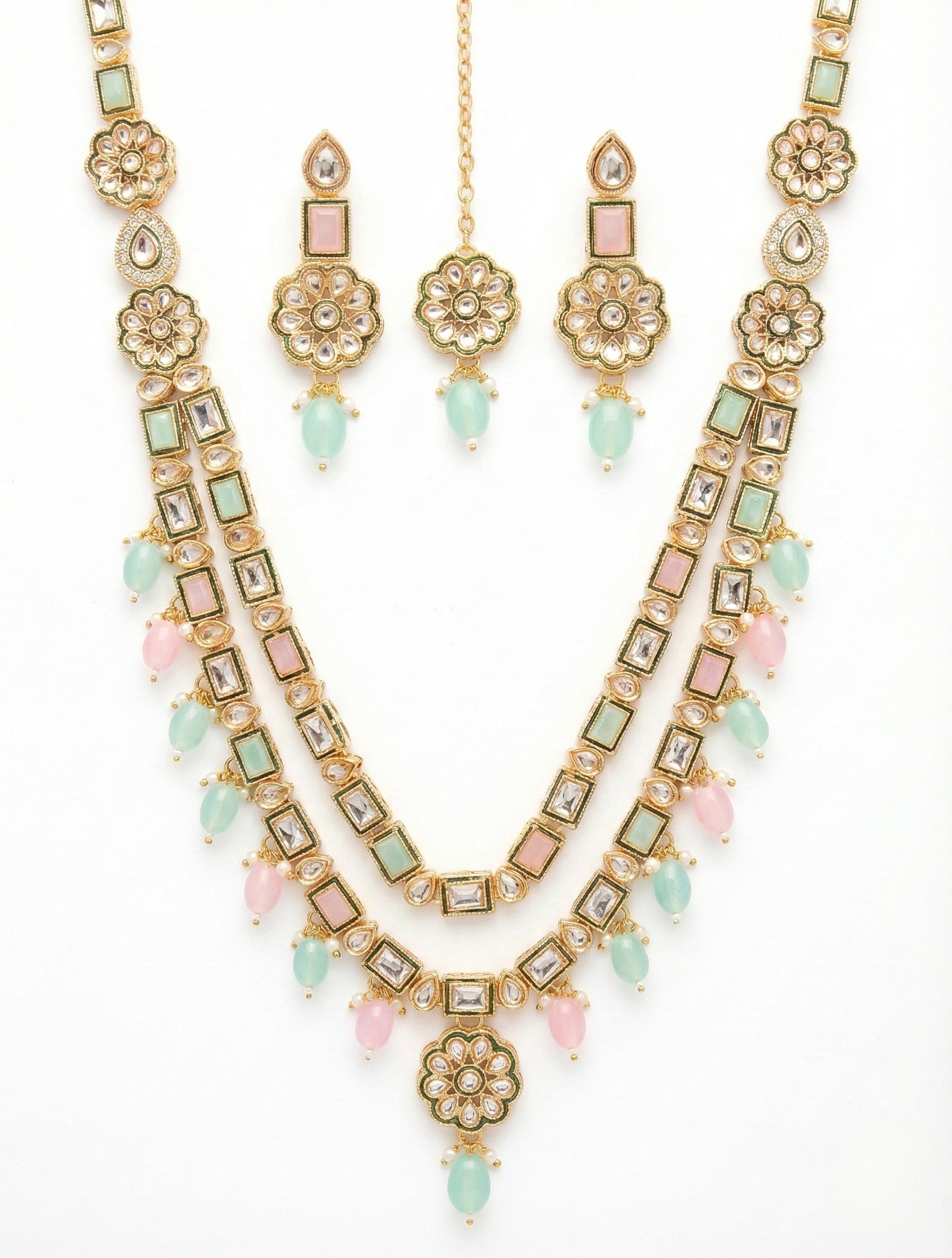 The Pastel Heritage Kundan Layered Necklace Set is a beautiful fusion of traditional royal craftsmanship and soft pastel elegance. Designed with premium kundan-style stones, this set features a graceful double-layer necklace highlighted with soothing mint green and blush pink stones, finished in a rich gold-tone polish.