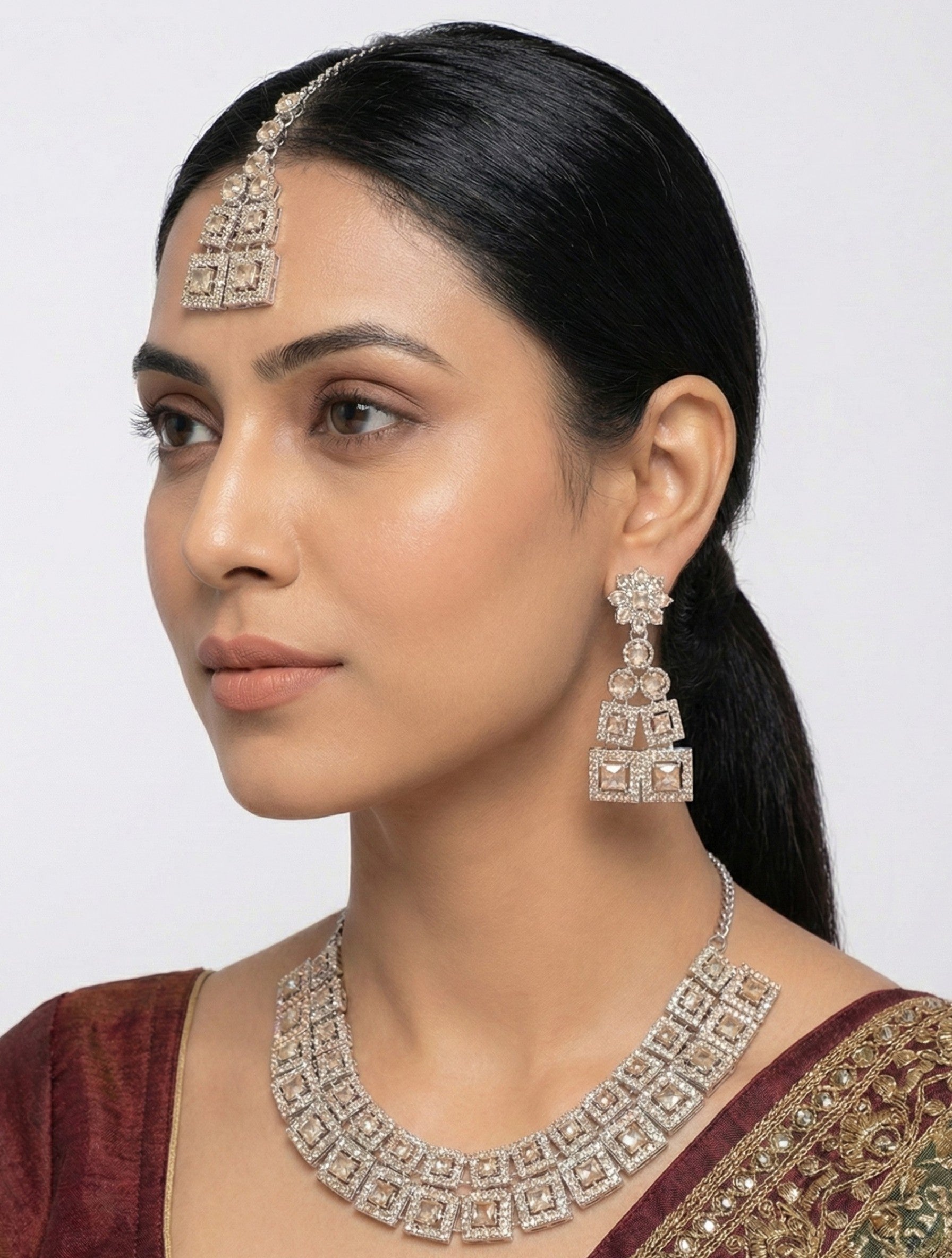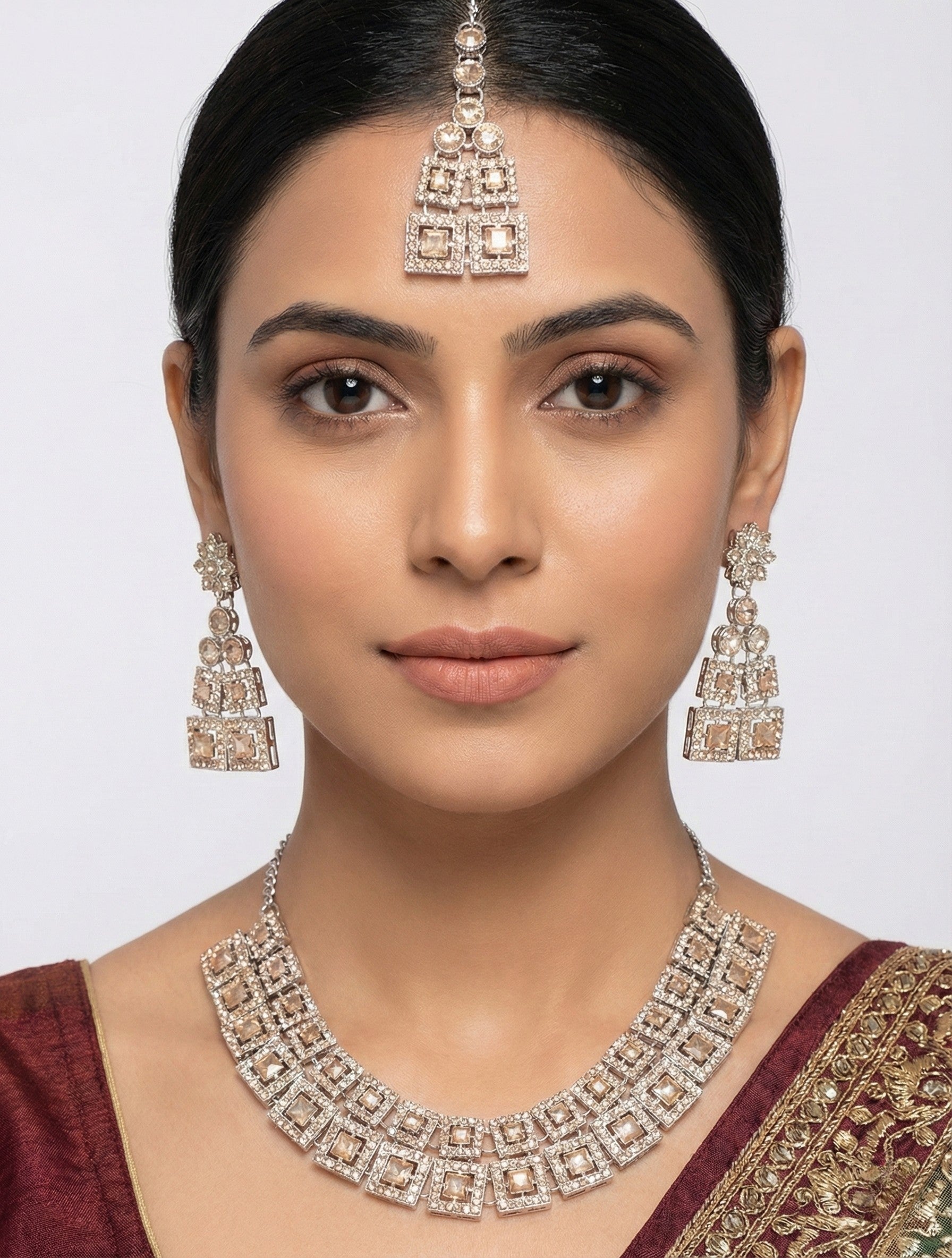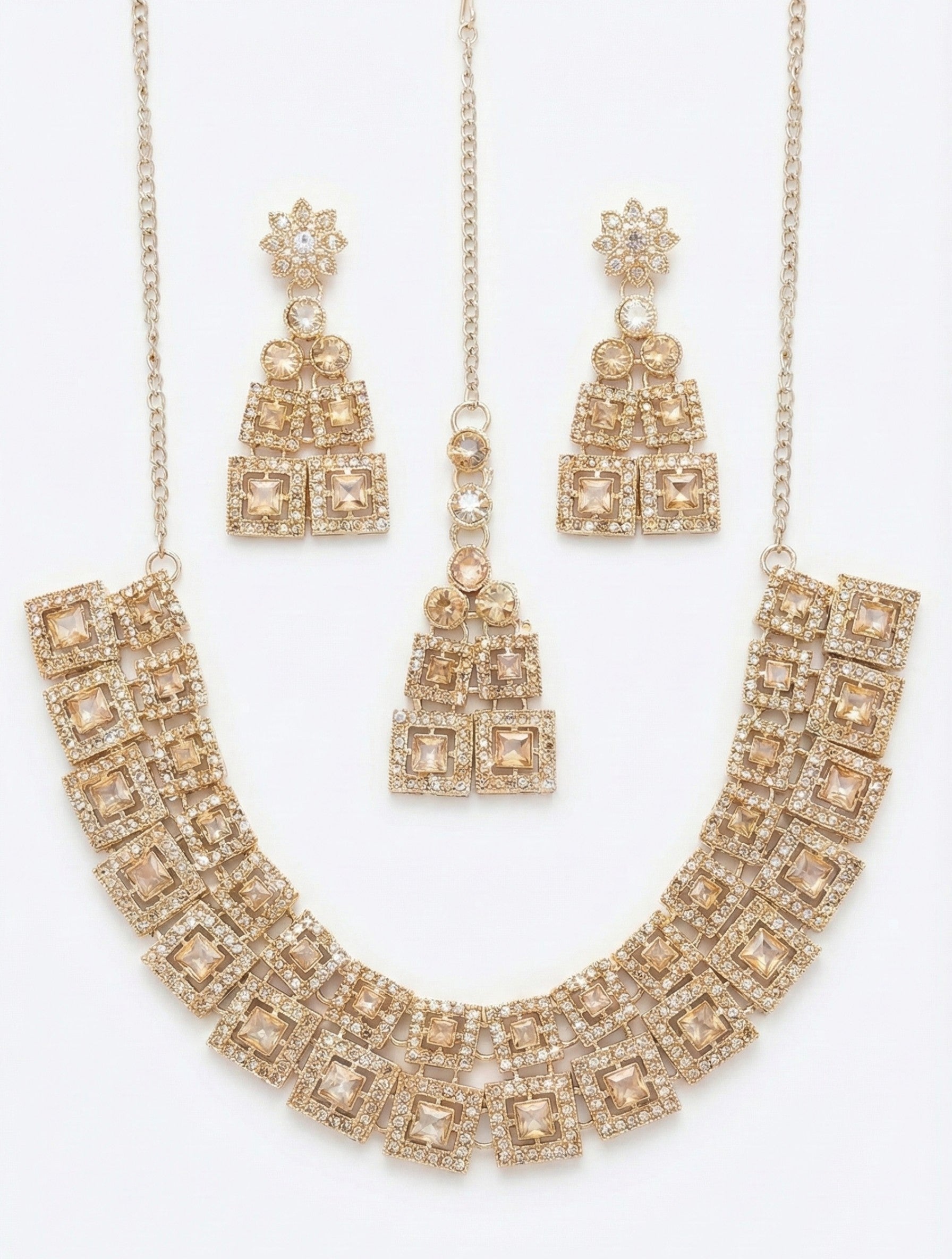 The necklace features a striking layered pattern of square-cut diamond frames, each accented with finely set micro American diamonds that enhance sparkle and depth. The structured design sits beautifully on the neckline, creating a powerful yet elegant presence. The set is completed with matching statement earrings and a perfectly coordinated maang tikka, all following the same square motif for a balanced, high-end appearance.