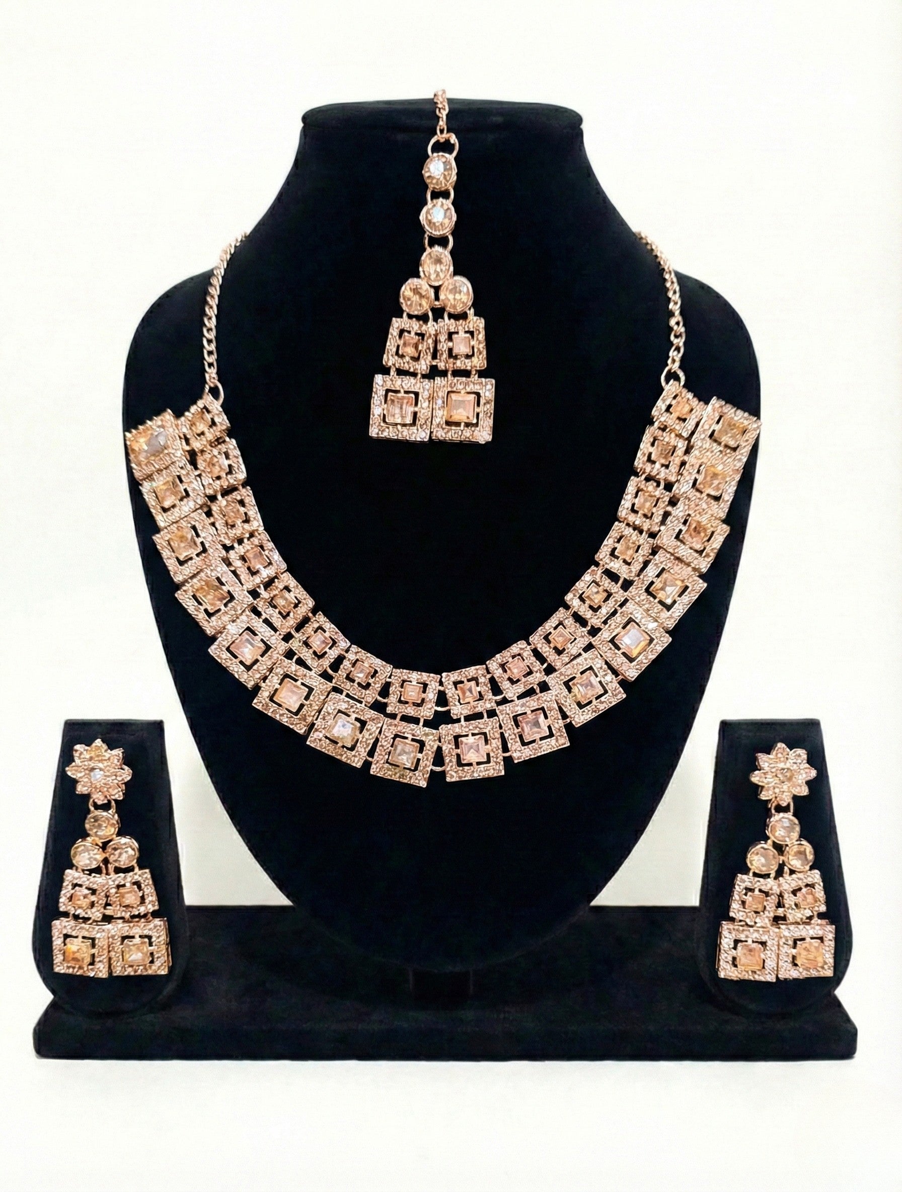 The Rose Gold Square Royale American Diamond Necklace Set is a luxurious statement piece designed for women who love bold geometry with a premium finish. Crafted with high-quality American diamonds and finished in an elegant rose gold polish, this set delivers a rich, modern royal look.