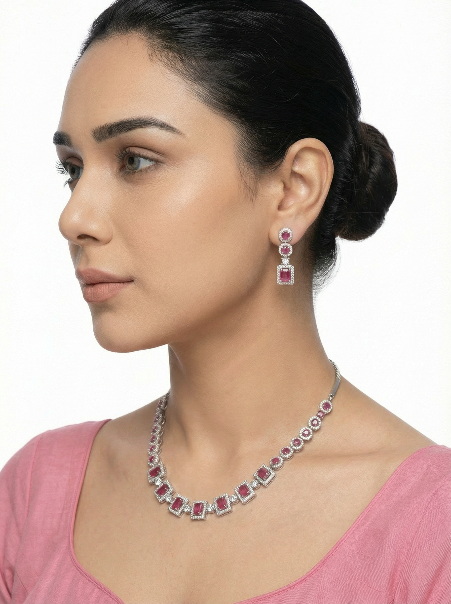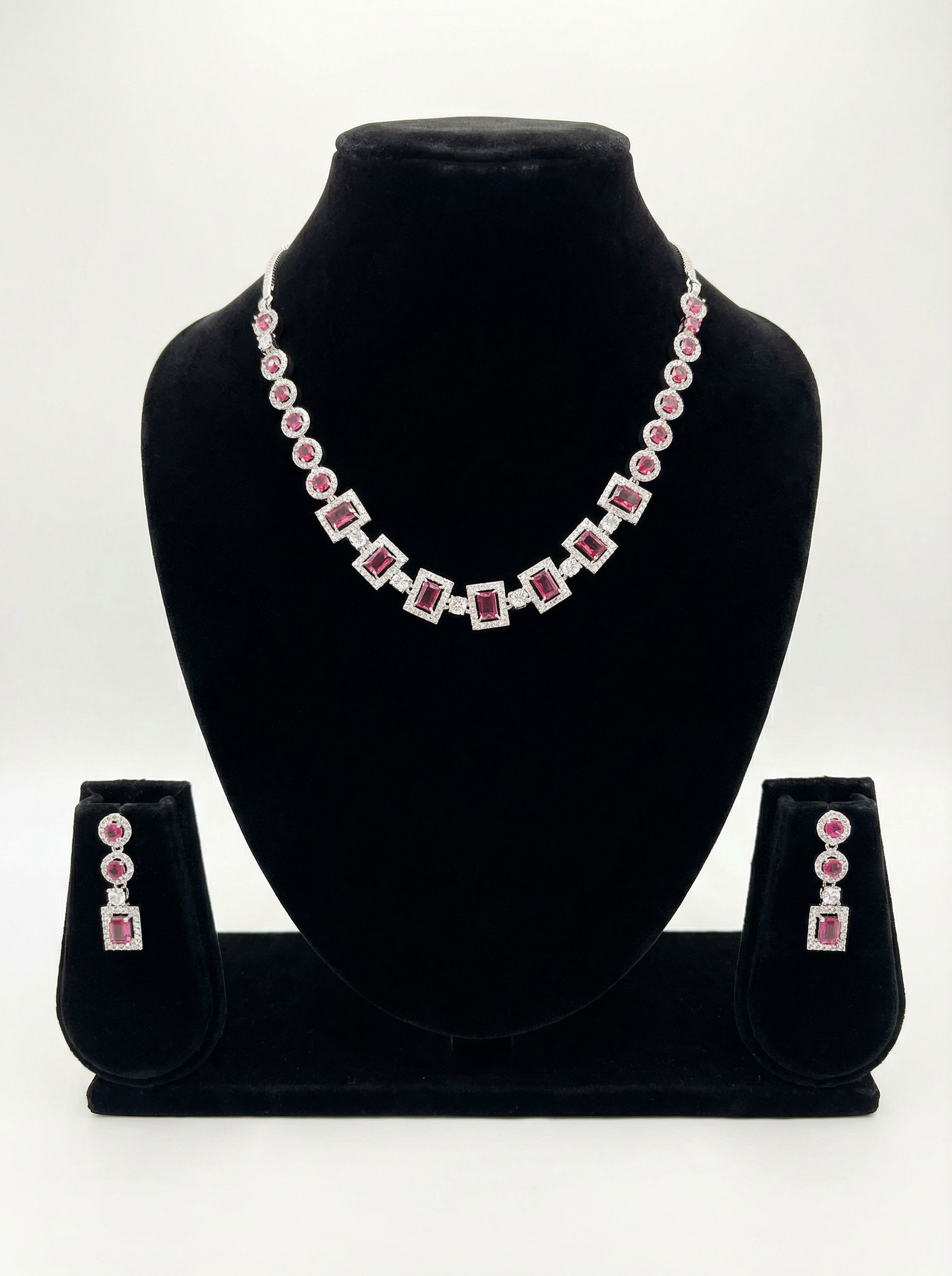Indulge in timeless sophistication with this exquisitely crafted necklace and earring set, adorned with radiant pink gemstones framed by shimmering diamond accents. Designed in a graceful geometric pattern, each stone reflects elegance, romance, and modern luxury. The soft blush hues beautifully complement the brilliance of the setting, making it a perfect choice for weddings, evening soirées, and grand celebrations.