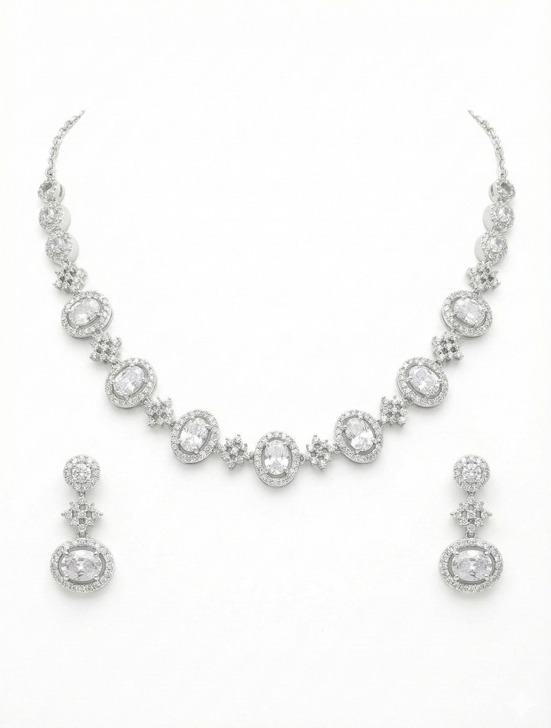 Each oval motif is surrounded by finely set diamonds, connected with delicate floral-style links that add grace and fluidity to the design. The matching drop earrings mirror the same oval and floral detailing, creating a complete and harmonious look. Finished in a polished silver-tone, this set delivers a rich diamond-like shine that looks luxurious and sophisticated.