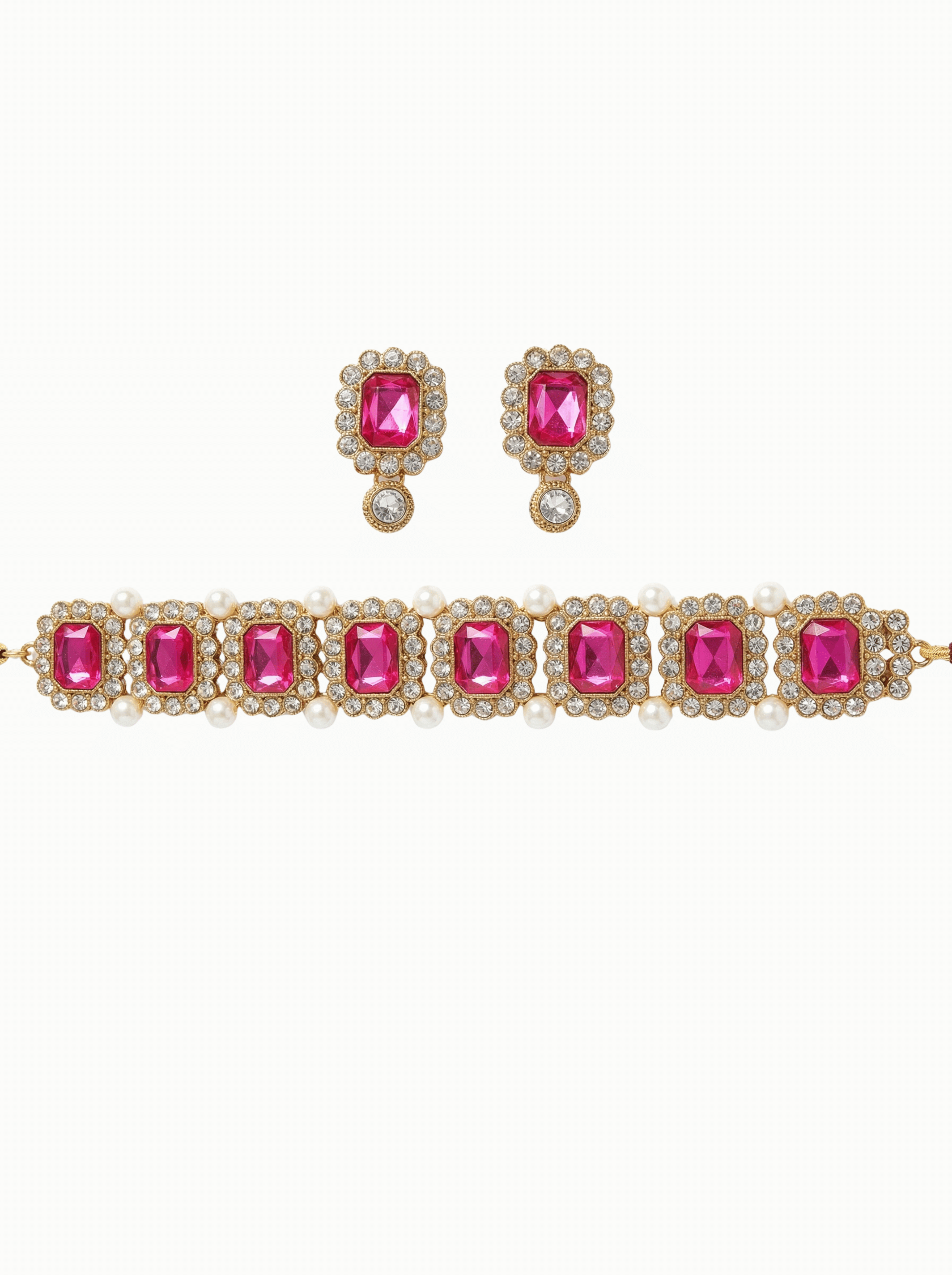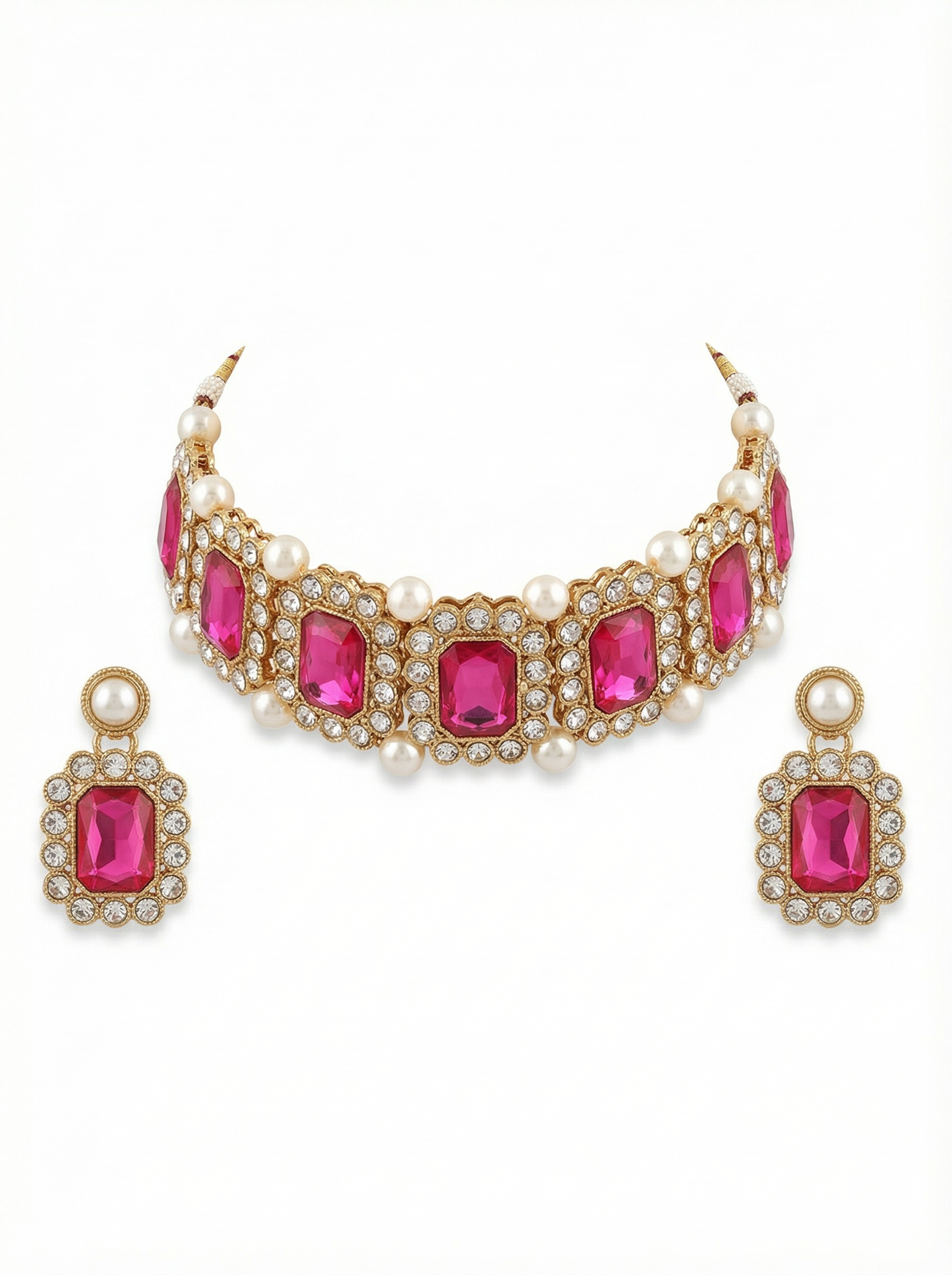The Ruby Pink Stone Pearl Choker Set is designed to make a bold yet elegant statement. The choker features rich ruby-pink rectangular stones set in a warm gold-tone base, framed with subtle crystal detailing and finished with soft pearl accents that add balance and refinement. The matching earrings follow the same design, giving the set a cohesive and polished look.