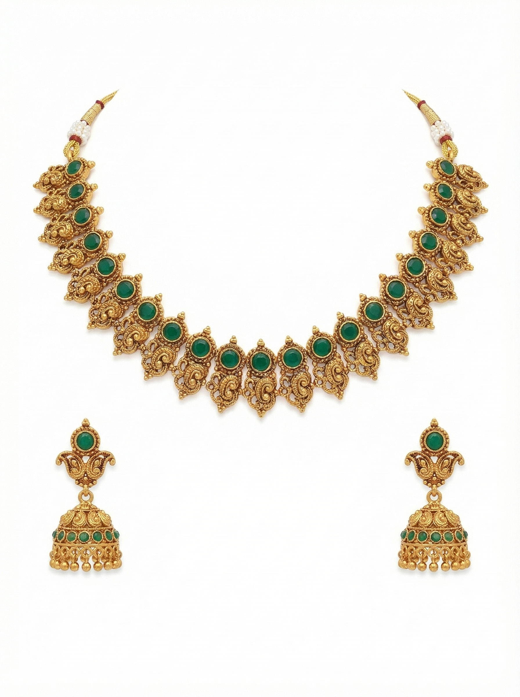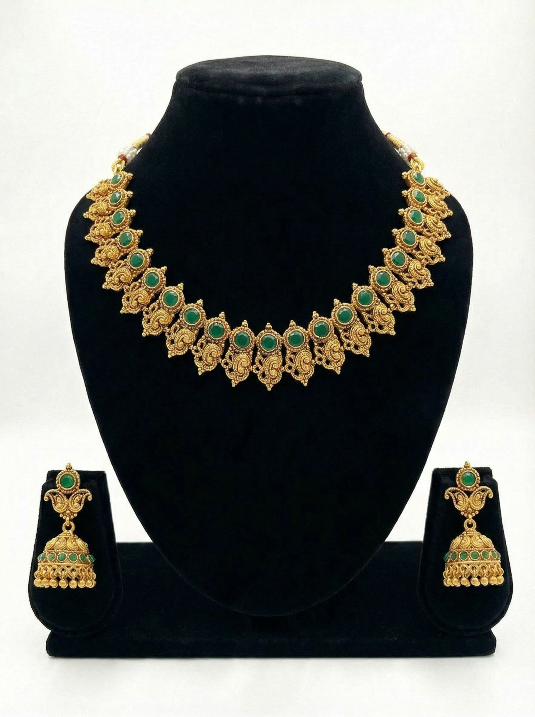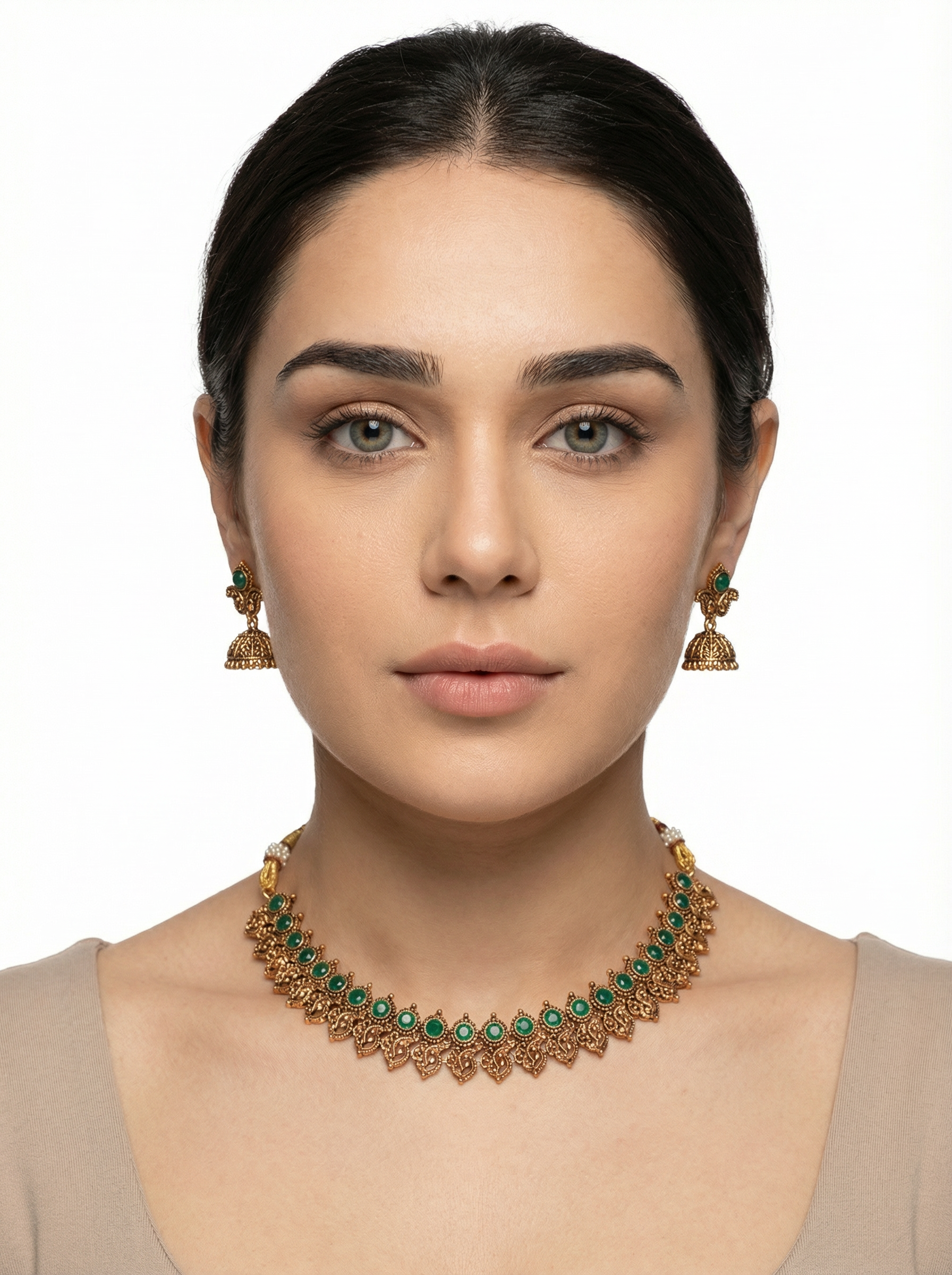 This temple-style necklace set features intricate nakshi craftsmanship inspired by South Indian heritage jewellery. The antique gold finish is paired with rich green stone settings, giving it a strong, rooted, traditional presence — the kind that instantly signals wedding wear, not casual fashion.